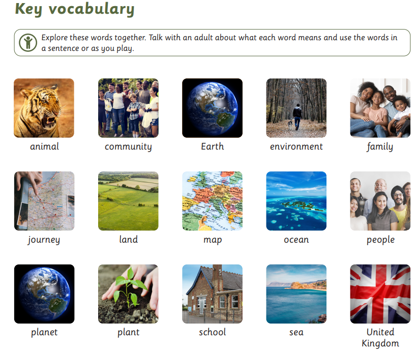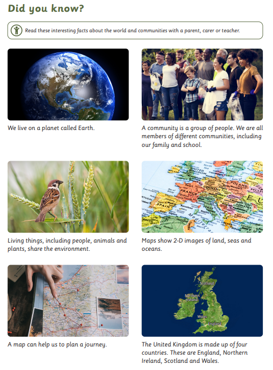 In the Let’s Explore project, your child will explore their class environment and school grounds so that they feel settled and happy in their new surroundings. They will learn about the local environment and find out about places they have visited on holiday. They will look at and create maps for journeys.